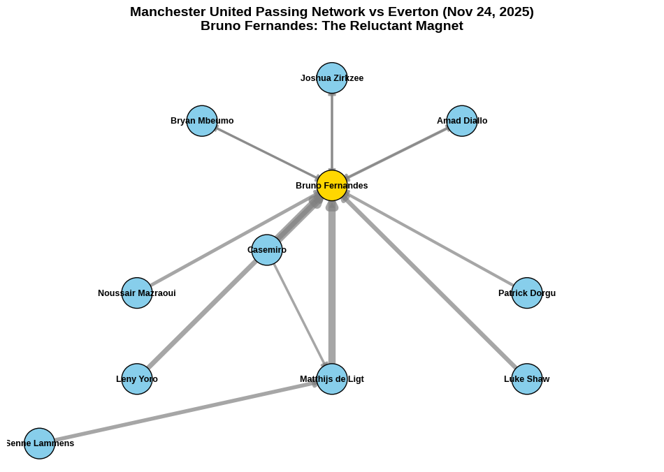 Manchester United’s defeat yesterday wasn’t just about losing to Everton, it was about reaffirming the club’s unofficial tactical motto: “When in doubt, give it to Bruno.” That was the whole 90 minutes. The passing map looked less like a team sport and more like a spider’s web with Fernandes at the center, catching everything.